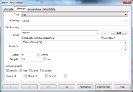 Diese Aktion wird immer jede "Stunde + Minute + Sekunde" gestartet, nachdem sie durch eine Aktions-Steuerung mit Status "on" aktiviert wurde.