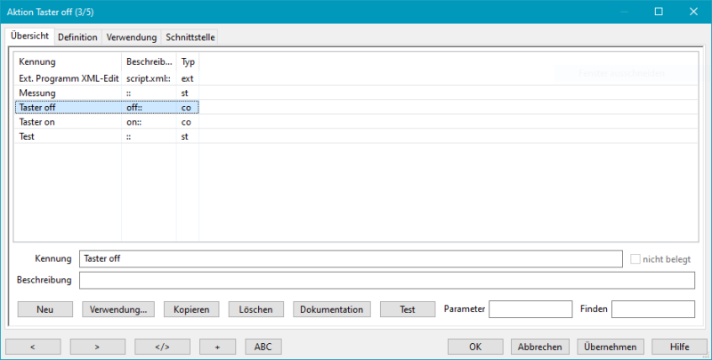 Falls keine Beschreibung angegeben ist, werden in diese Spalte Befehl::Parameter aus der Registerkarte 'Definition' angezeigt.