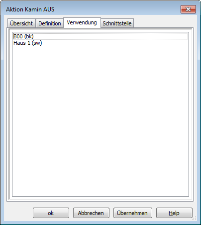 Diese Registerkarte listet alle Objekte "Kennung (Typ)", deren Aktions-Steuerung die in der Übersicht ausgewählte Aktion verwendet.