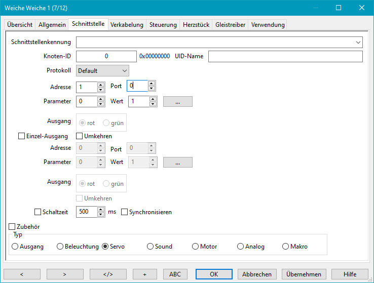 Dieses Beispiel zeigt, wie Servo-Port 1 an einer Lichtsteuerung adressiert wird. Die Option 'Zubehör' darf nicht aktiviert sein.