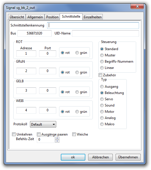 Diese Beispiel zeigt, wie Licht-Ports 1 - 4 auf MoBaLiSt adressiert werden. Die Zubehör-Option (Accessory) darf nicht gesetzt sein.