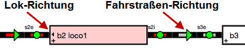 In diesem Bildschirmfoto zeigt der Zug in die der definierten Fahrstraße entgegengesetzte Richtung: