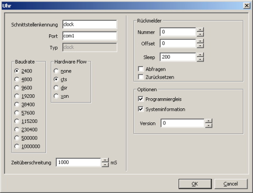 Im Dialog des Modellzeit-Uhr-Treibers wird nur der verwendetet COM-Port eingestellt. Für die Uhr sind die anderen Parameter dieses universellen RS232-Dialogs ohne Bedeutung.