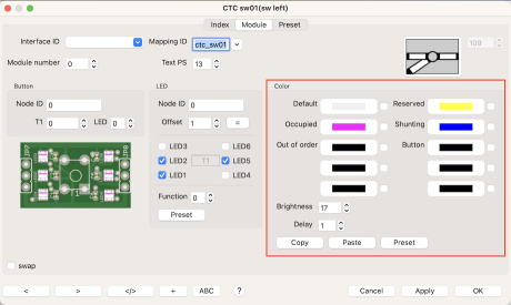 Configuring the LEDs in most cases is done by clicking the button "Preset". The checkboxes for the 6 LEDs fitting to the CTC object will be setup automatically. The LEDs will illuminate the track portion of the CTC module.