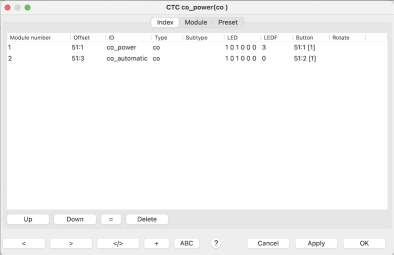 | Module | Objet Rocrail | Identifiant de Mappage | Bouton | LEDs | Accessoire No. |