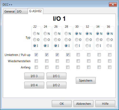 - Klick auf die Schaltfläche I/O 1 um die aktuellen Porteinstellungen zu auszulesen.