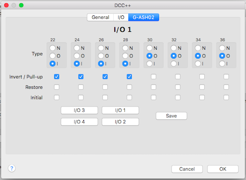 Setting port 30, 32, 34 and 36 to Output type on connector I/O 1: