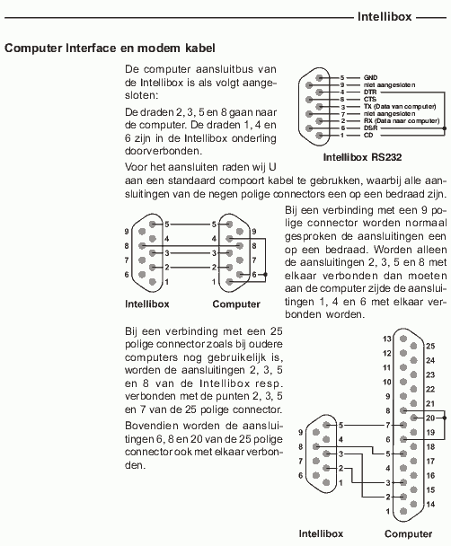 Standaard wordt de Intellibox (IB) met een RS232-kabel verbonden met de PC. Wanneer de computer geen RS232-poort meer heeft kan gebruik worden gemaakt van een adapter. Zie ook het hoofdstuk RS232-kabel maken aan het eind van deze pagina.