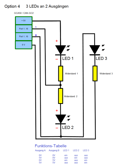Für den Anschluss der LEDs (und der immer notwendigen Widerstände) gibt es mehrere Optionen: