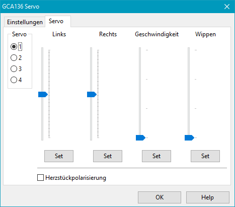 Danach können auf der Registerkarte "Servo" die Einstellungen für die vier Servos vorgenommen werden.