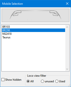 The Mobile Selection dialogue is a shared dialogue which is used to assign a loco to a block, to select a locomotive for the Mouse Integrated Controller (MIC) and to select a locomotive to be controlled by a gamepad.