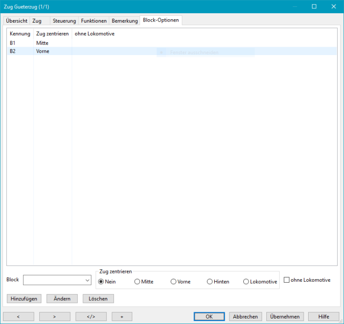 | Mitte / Vorne / Hinten | Der Zug wird entsprechend dieser Option im Block zentriert. |