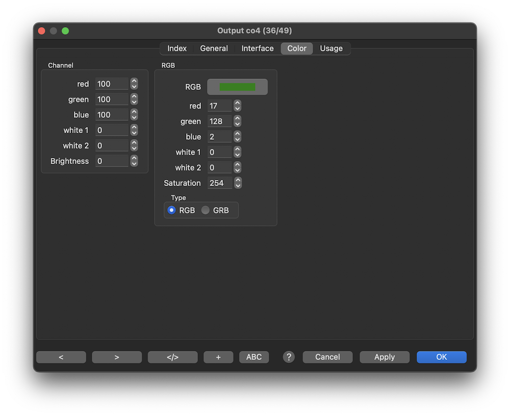 De RGB-kanalen voor de Kleur type licht uitgang (poort).