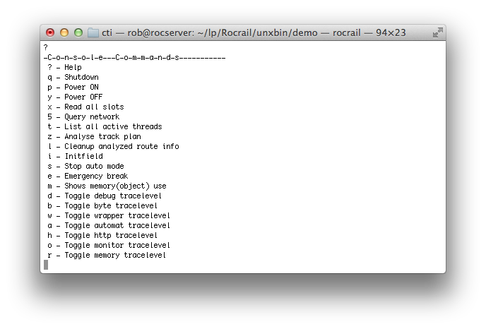 Per avviare Rocrail in modalità console aprire un finestra di comando, andare nella directory di Rocrail ed eseguire Rocrail con il parametro console.