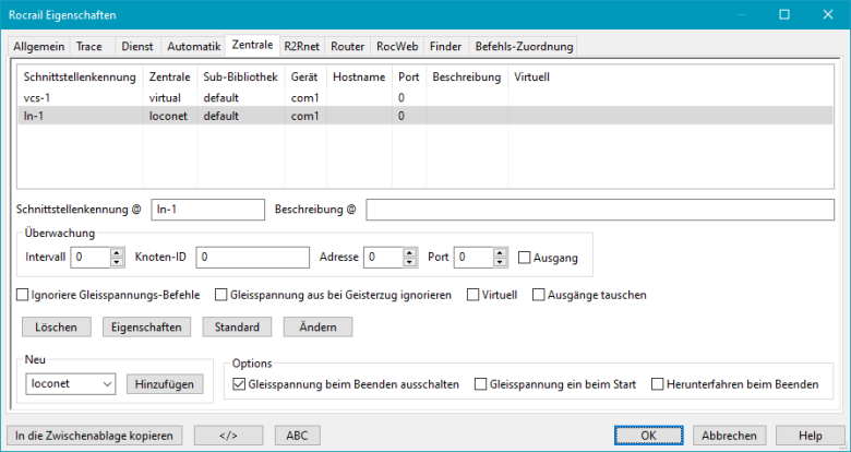 Rocrail-Eigenschaften Registerkarte 'Zentrale'