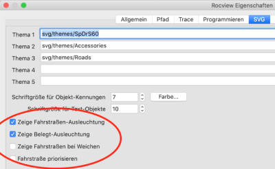 Mehrere Parameter bestimmen die Farbe der Gleiselemente und damit die Darstellung der Fahrstrassen: