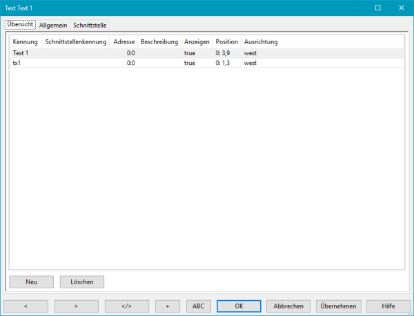 Es wird ein neues Text-Objekt "NEW" erzeugt. Auf der Register-Karte "Allgemein" sollte die Kennung erklärend geändert werden.