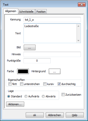 Einzelheiten zu den Registerkarten des Text-Dialogs und Beispiele sind beim Text-Objekt beschrieben.