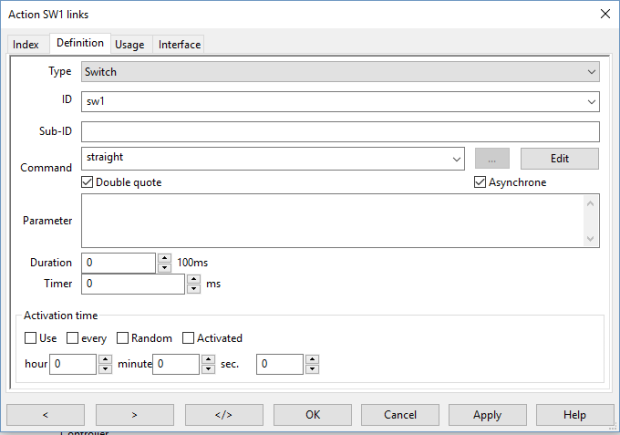 The action "SW1 Links (Left)" for turnout sw1 by output A2L (nomenclature: 2= Block 2, L= Left side) of the block.