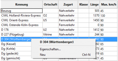 Die Tabelle wird entsprechend der Werte in der Spalte auf- oder absteigend sortiert. Die Spalte “Kennung” wird stets nur aufsteigend sortiert. - Rechtsklick auf einen Zug in der Tabelle: