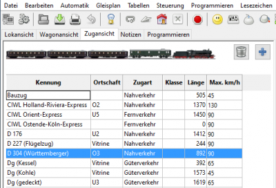 - Mit dem "+"-Symbol kann ein Zug neu angelegt werden.