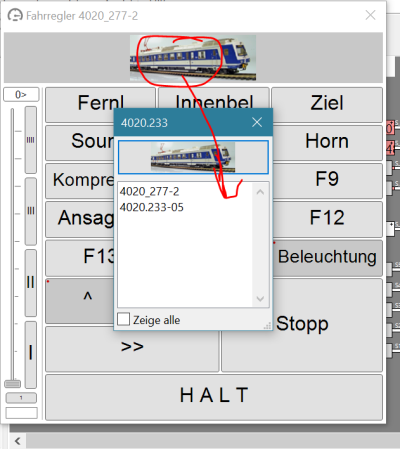 Variante b: Über den Fahrregler der Lok, wenn dieser ein Zug zugeordnet ist, durch Klick auf die Schaltfläche 'Umschalten' [ ^ ] und anschließend auf das Lokbild unterhalb der Titelleiste. Wenn man in einen Regler eines Wagens gewechselt und die Schaltfläche 'Umschalten' noch immer aktiviert ist, genügt auch ein einfacher Klick auf das Lokbild, um zum Auswahlmenü zu gelangen.