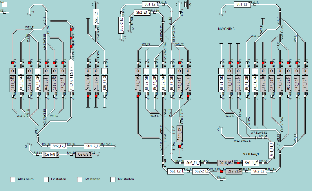 Links die Blöcke Bf_E3_Gl1 bis Bf_E3_Gl8, die Bestandteile eines Schattenbahnhofs für 2 Nahverkehrs- bzw. Güter-Nebenbahnzüge (Aufstell-Block), 3 Fernverkehrszüge und 4 Güterzüge sind.