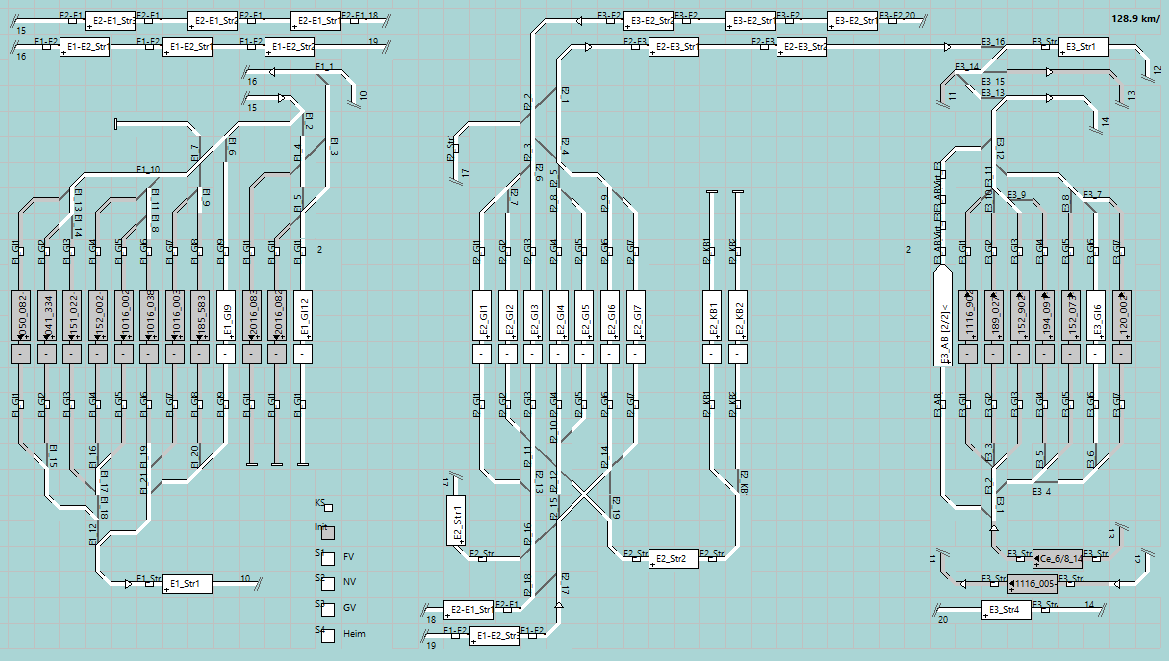 Im Bf. E3 gibt es im Aufstellblock E3_AB nur Platz für 2 Züge vom Typ NV und GNB. Käme ein dritterZug dieser Typen an, müßte er vor dem Bf. warten und blockierte somit alle anderen Zugtypen. Das folgende xmlScript steuert die Anzahl der Fahrten der Zugtypen NV und GNB zum Bf. E3. Das Textfeld "NV/GNB:" links oberhalb vom Block E3_AB zeigt die aktuelle Anzahl von Zügen (hier "2") dieser Zugtypen im Bf. und am Weg zum Bf. an.