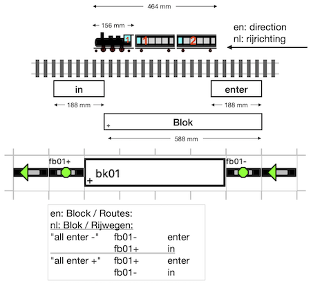 - Een blok moet twee melders hebben (er zijn uitzonderingen) voor de gebeurtenissen ENTER (trein komt een blok binnen) en IN (trein is compleet in het blok aangekomen).