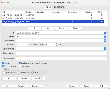Two actions are defined to switch the output "co_Freight_Lights" ON or OFF.