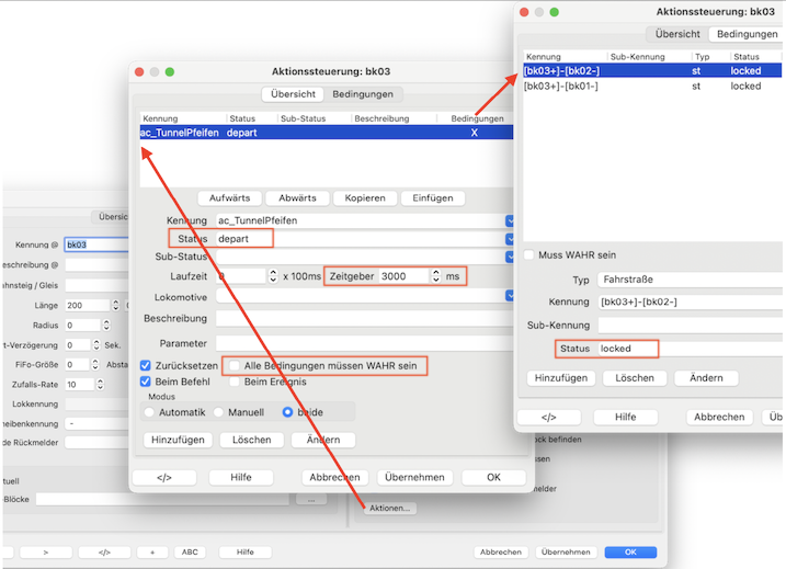 Die Aktion "ac_TunnelPfeifen" wird ausgelöst, wenn die Lok im Block losfährt (Status gleich "depart").
