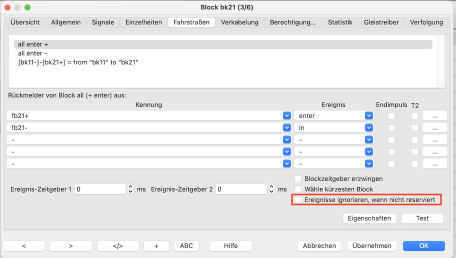 Damit der Rückmelder fb22- keine Ghost-Meldung in dem Block bk22 auslöst, wird die Option "Ereignisse ignorieren, wenn nicht reserviert" aktiviert: