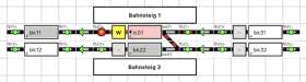 b) eine Lok startet im Block bk32, der Ziel-Block bk11 ist belegt: