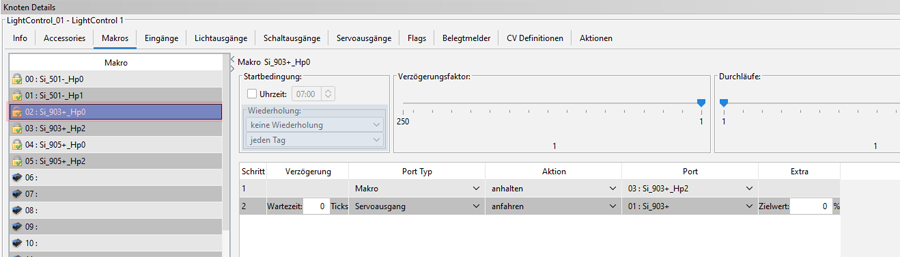 Das Makro Si_903+_Hp0 zeigt die Befehlsfolge, welche abgearbeitet wird, sobald Rocrail den Befehl zum Stellen des Formsignals Si_903+ in Stellung Hp0 an die LightControl sendet.