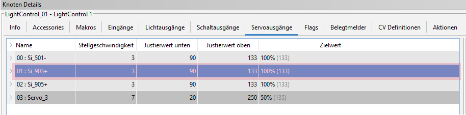 Schritt 1a: Definieren der Servo-Parameter im Servoausgänge-Tab der Baugruppe (hier am Beispiel LightControl)