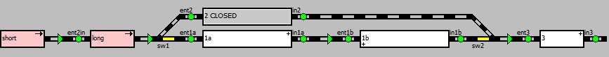This demo plan has -hopefully- self-explaining names for the objects. The idea behind this plan is that a (shadow)station can have two blocks behind each other. Each of these blocks 1a and 1b can contain a short train, whereas a long train will occupy both blocks, using a route to block 1b with block 1a as via block.