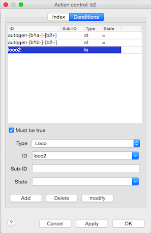 The conditions defined in this dialog apply to the action control of the action selected in the "Index" list.