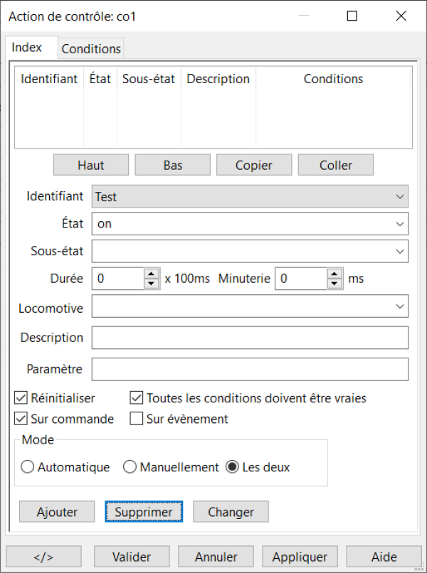 Pour les aiguillages, les sorties et les objets de signalisation définir si les actions seront listées à une commande et/ou un événement.