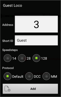 The default is DCC and 128 speed steps if only the address is set. In this case the loco ID will be the same as the address.