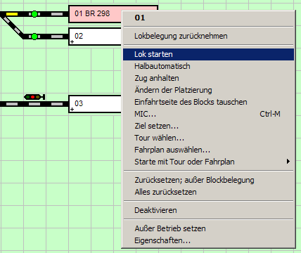 Nun muss noch einmal das Kontextmenü des Block aufgerufen werden und Lok starten gewählt werden: