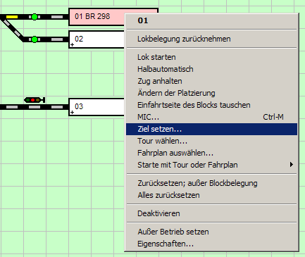 Statt mit Ziehen und Ablegen wie oben beschrieben kann die Lok auch aus dem Kontextmenü des Blocks gestartet werden: Ein Rechtsklick auf das Symbol des Block's in dem sich die Lok befindet öffnet das Menü. Dort wird der Befehl Ziel setzen… ausgewählt.