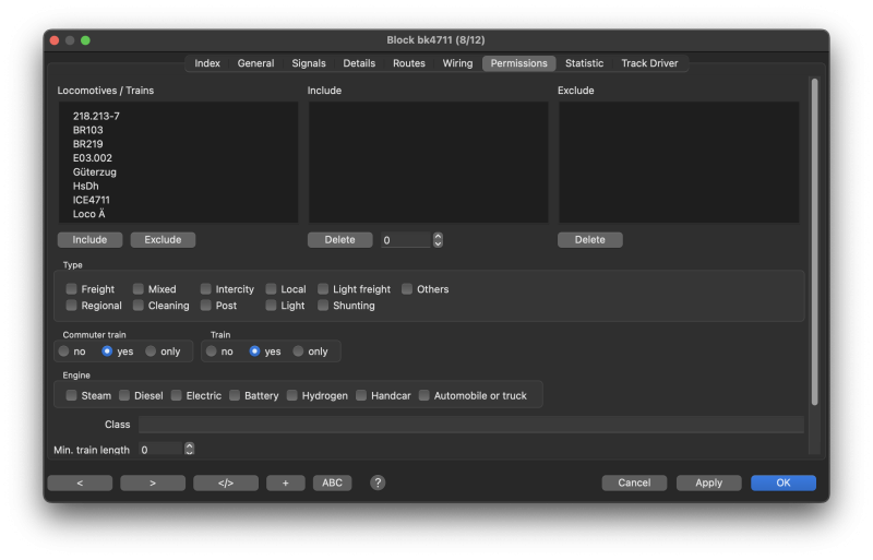 To prevent certain Locomotives and or Trains entering a block in automatic mode this tab can be used to define which are permitted or not.