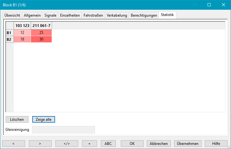 - Übersicht | Allgemein | Signale | Einzelheiten | Fahrstraßen | Verkabelung | Berechtigungen | Statistik | Gleistreiber | Verfolgung | Menü | Eingebettete Rückmelder