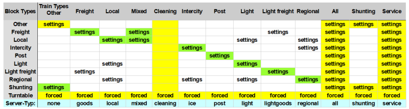 En plus des types de train mentionnés ci-dessous, le type tous obéit aux réglages d'attente dans tous les types de bloc. Pour les trains des types tous et wagon nettoyeur tous les types de blocs sont une destination préférée à condition que le même train était le dernier train entrant dans ce bloc.
