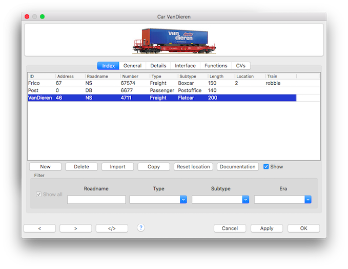 Only cars in the same locality are listed in case this dialog is used to add cars to a train in the Operator dialog.