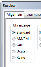 Die Art der Uhr-Darstellung kann im Dialog über Rocview-Menü Datei --> Rocview Eigenschaften, Registerkarte "Allgemein" definiert werden: