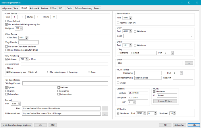 Alternativ kann der Uhrzeit-Dienst (zusätzlich die Uhrzeit) im Dialog über Rocview-Menü Datei --> Rocrail-Eigenschaften, Registerkarte "Dienst" eingestellt werden: