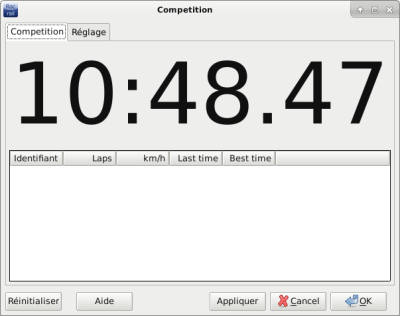 Cette fenêtre de dialogue Compétition apparaît automatiquement, si elle n'est pas déjà active, sur un évènement compétition venant du serveur Rocrail.