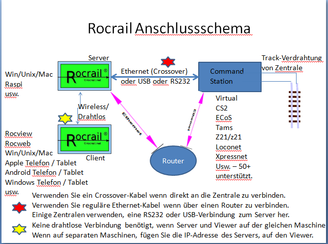 Diese Seite versucht zu zeigen, wie der Server und der Client von Rocrail miteinander kommunizieren können und wie die Software eine Verbindung zu einer Zentrale herstellen kann, die wiederum mit dem tatsächlichen Bahn verbunden. Diese Verbindungen ermöglicht dem Benutzer ein Bahn zu haben, das durch einen Computer gesteuert und betrieben werden kann.