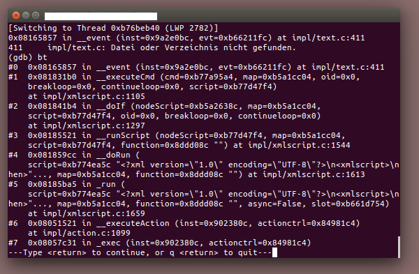 The GNU Debugger is still active, and with the bt command the backtrace will be listed in the terminal.